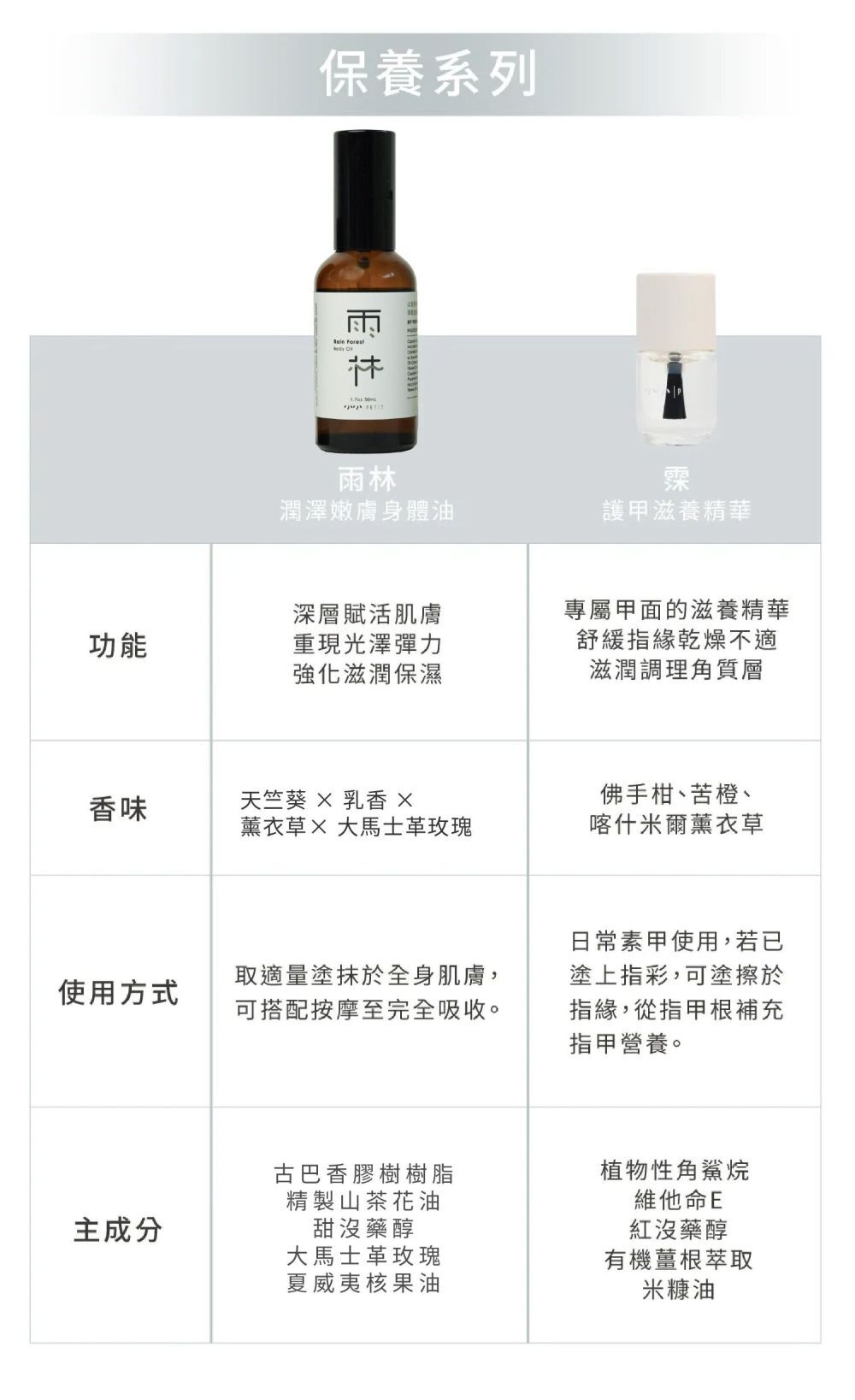 雨林使用植物油,本身有良好的潤滑、填補作用,可以在乾髮時滴於掌心搓勻後輕撫髮梢。
