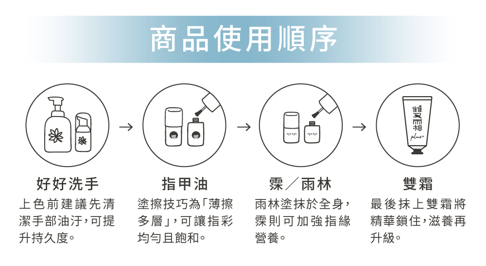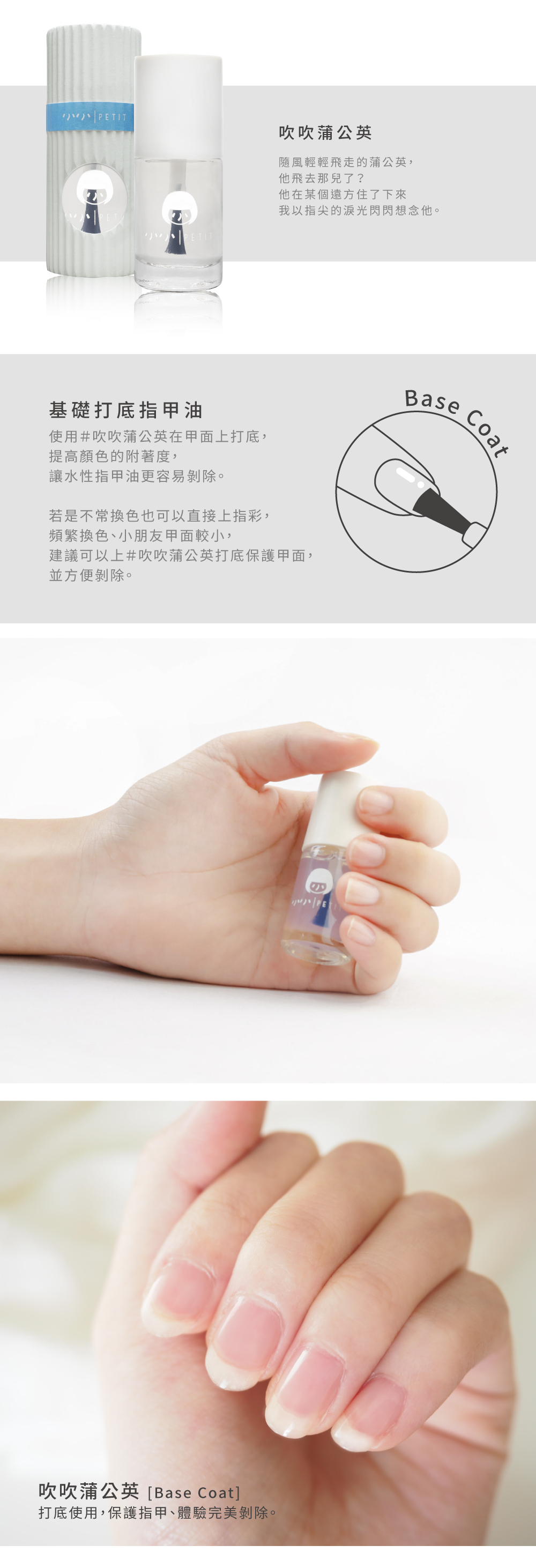 請先徹底清潔甲面油脂,再使用#吹吹蒲公英(基礎打底指甲油)在甲面上打底,可以提高顏色的附著度,讓水性指甲油更容易剝除。