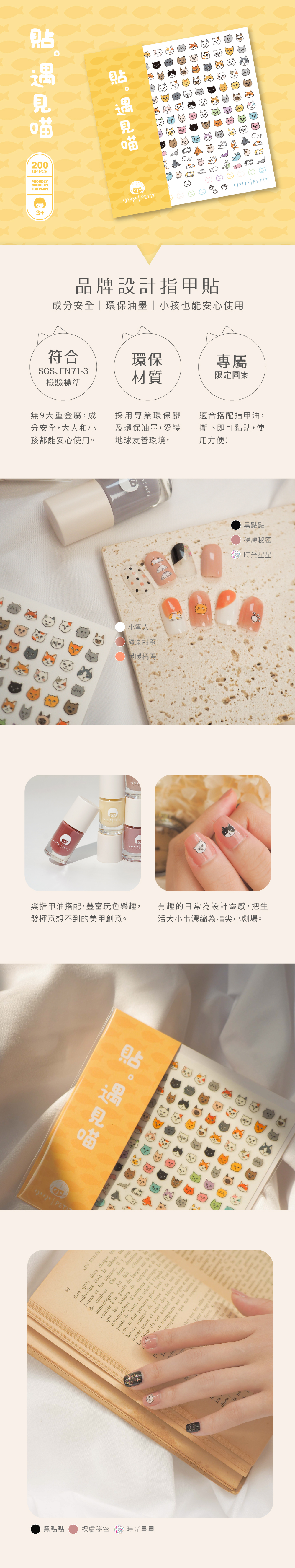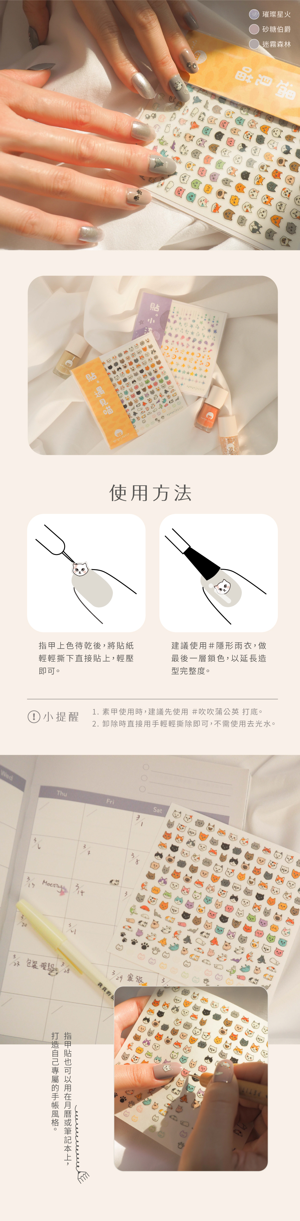 ●指甲油上色待乾後,將貼紙直接貼上,輕壓後使用"隱形雨衣(外層護色指甲油)"做最後一層鎖色,延長造型持久度。