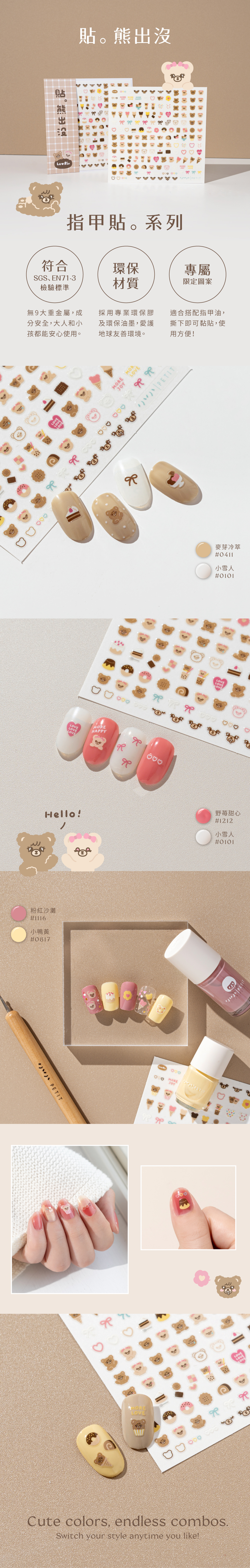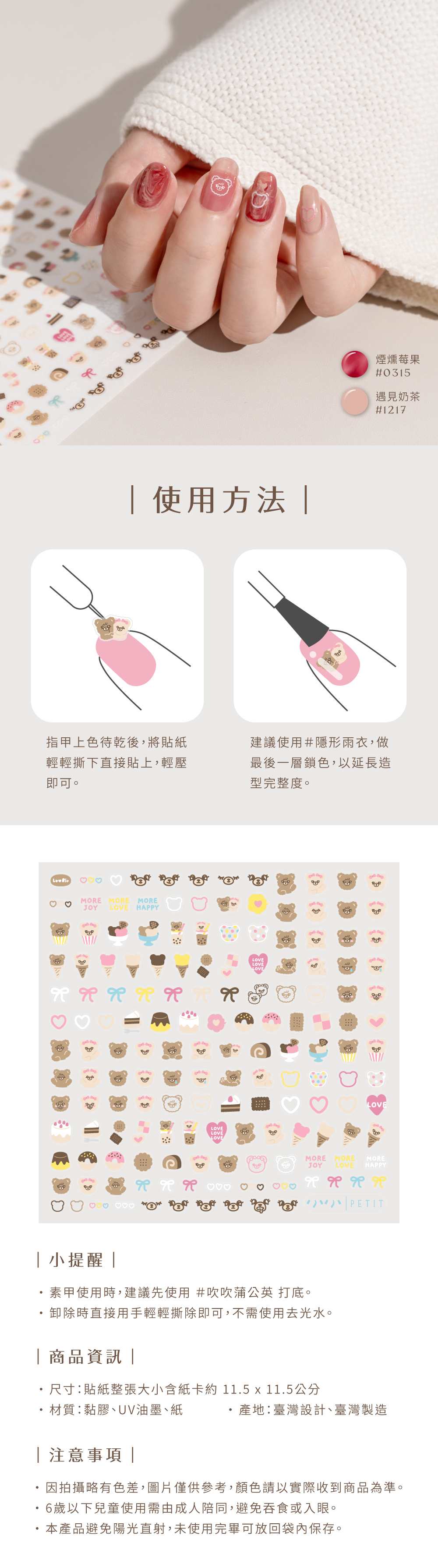 ●指甲油上色待乾後,將貼紙直接貼上,輕壓後使用"隱形雨衣(外層護色指甲油)"做最後一層鎖色,延長造型持久度。