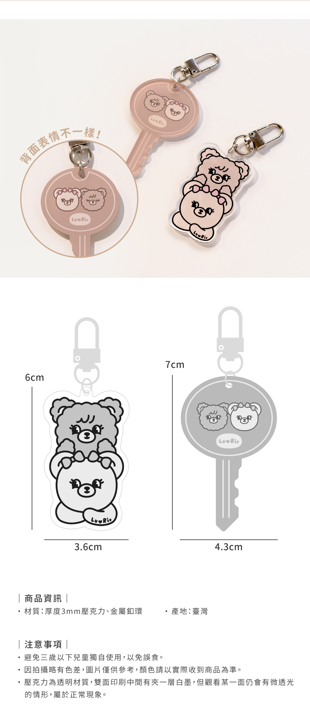 注意事項:壓克力為透明材質,雙面印刷中間有夾一層白墨,但觀看某一面仍會有微透光的情形,屬於正常現象。
