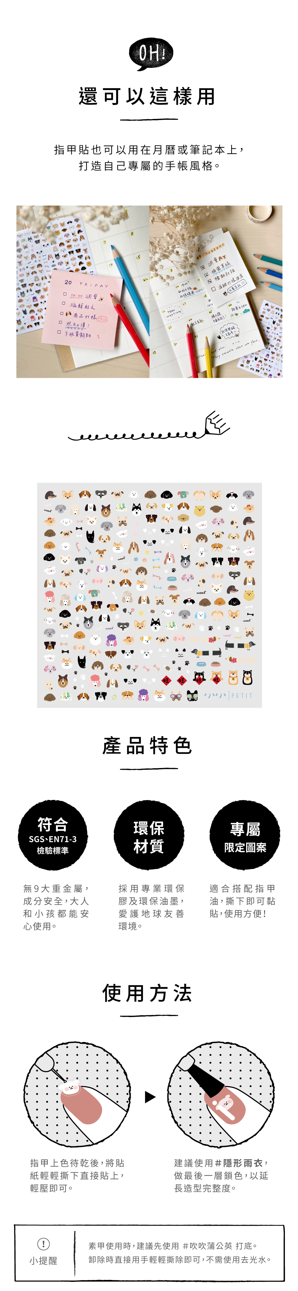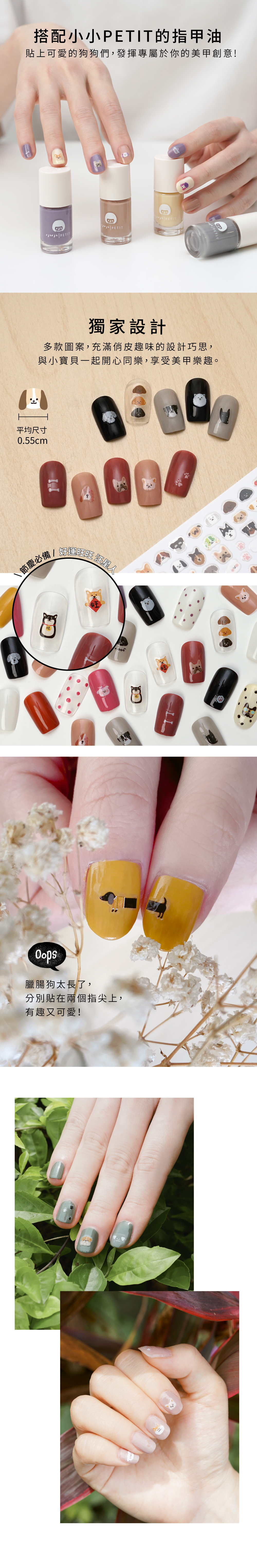 ●指甲油上色待乾後,將貼紙直接貼上,輕壓後使用"隱形雨衣(外層護色指甲油)"做最後一層鎖色,延長造型持久度。