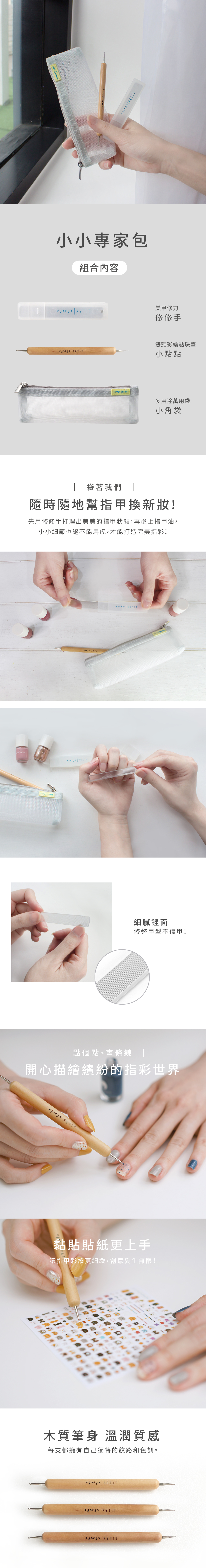 ●木質筆身,突顯溫潤質感。輔助指甲貼使用超順手。